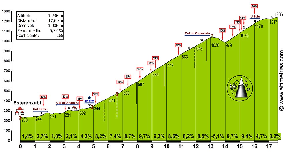 Esta ascensión nos lleva hacia la cima del Urkulu desde las mismas fuentes de la Nive (Errobi), el río que se unirá al Adour (Aturri) poco antes de su desembocadura en Baiona. Los primeros kilómetros desde el puente de Esterenzubi van a ser una sucesión de tramos llanos y alguna rampa de cierta consideración, por un trazado rectilíneo que mantiene la Nive a nuestra derecha. Cuando llegamos a la pista que se dirige a las fuentes de dicho río y atravesamos un bello puente dejando un hotel a la izquierda. Los 8 km siguientes son de una gran dureza y en su primera parte las rampas exigentes alternan con breves descansos que nos impiden coger un ritmo regular de pedaleo.