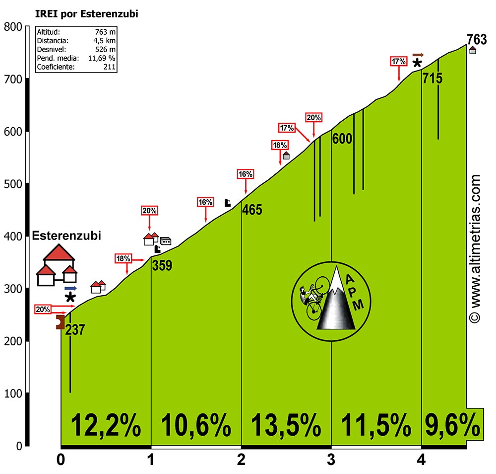 Hablamos de un puerto corto en kilometraje pero terrible. Este collado de Irei une el pueblo de Esterenzubi y el de St. Michel, ambos en el valle del río Nive, a través de la cresta que desciende desde el pico Hastategi. Para que nadie se sienta engañado, la subida se manifiesta desde su mismo inicio en toda su crudeza, con una rampa inicial al 20%. Si conseguimos llegar a un cruce 100 m más arriba, trazaremos una herradura izquierda y daremos vista al valle desde la ruta que se ha convertido en espléndido mirador.