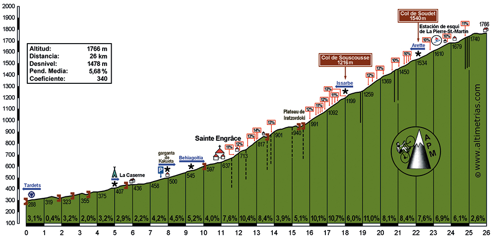 La localidad de Santa Garazi (Urdax) es conocida por su iglesia románica del siglo XI, único resto visible de una colegiata que tuvo gran importancia durante la Edad Media. Pasamos el pueblo y la pendiente se endurece considerablemente durante los 3 km siguientes, con el intermedio al 10,4%, para adentrarnos en una zona boscosa y dejarnos caer en un breve descenso que nos permitirá tomar aliento. Justo después de este leve respiro y tras una rampa al 13%, llegaremos al paradisíaco Plateau de Iratzordoki, con pendientes muy modestas. Tras finalizar este “llano” y hasta alcanzar el col de Souscousse (donde enlazaríamos a la izquierda la ruta del col de Issarbe), habremos debido vencer casi 3 km al 10% de pendiente media. Desde ahí, hasta el Soudet otros 5 km con uno que supera el 11% de media. Coronamos el Soudet y entramos en la D132. Ya vemos al fondo la estación de Arette y prácticamente la cima, justo en la frontera con Navarra. Habrán sido casi 26 km en los que habremos subido casi 1500 metros de desnivel.